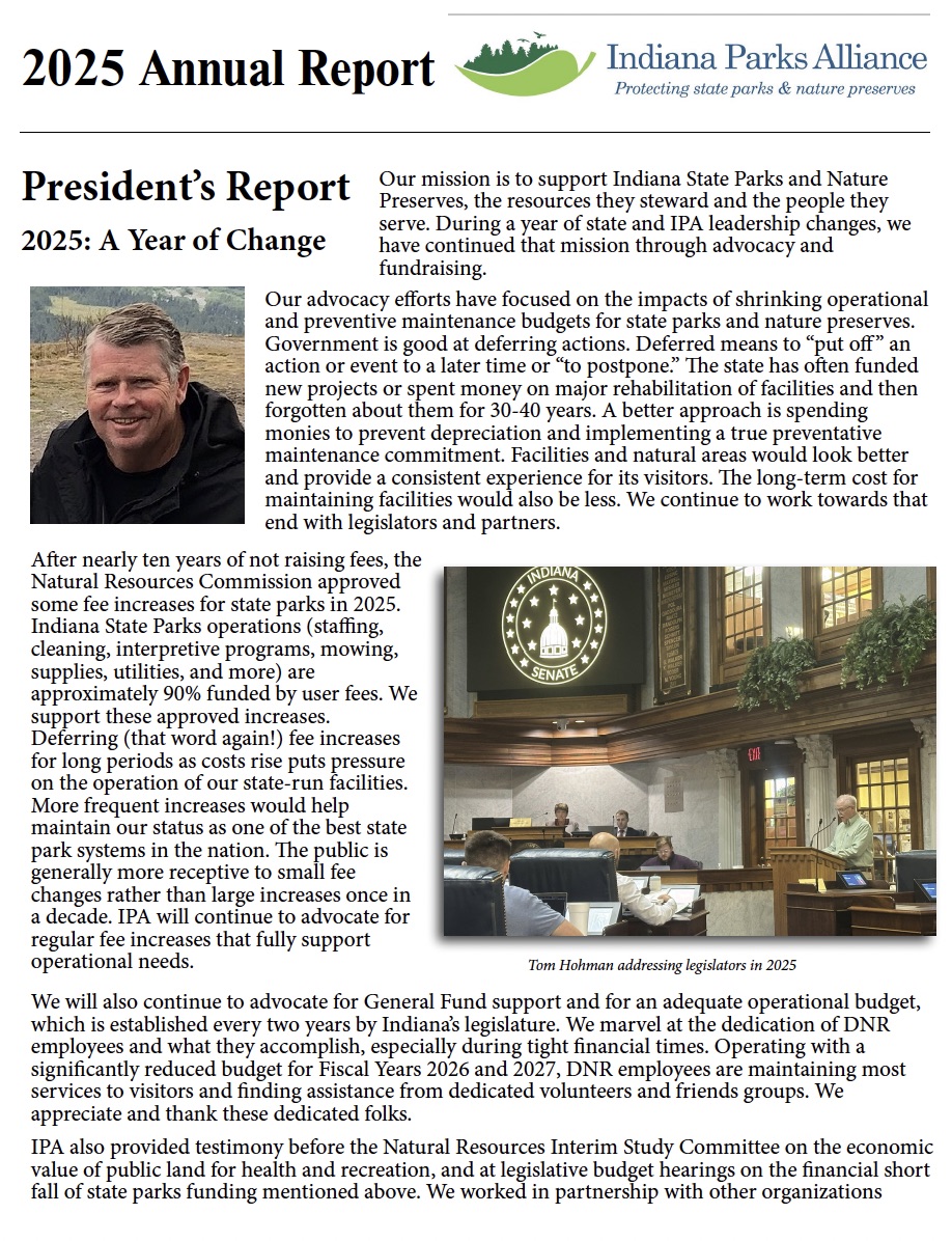 The Indiana Parks Alliance (IPA) is a charitable organization that supports Indiana State Parks and state-owned Nature Preserves, the resources they steward and the people they serve.